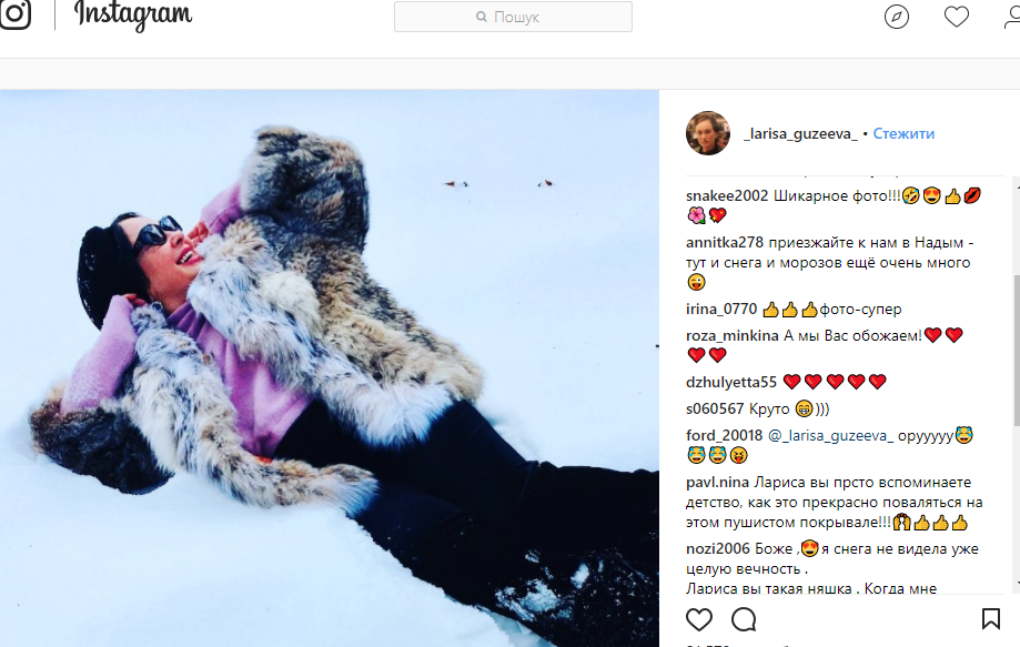 Известная российская актриса и телеведущая Лариса Гузеева показала в соцсети, насколько она была рада выпавшему снегу. Артистка опубликовала в Instagram фото, на котором она запечатлена лежащей в снегу.