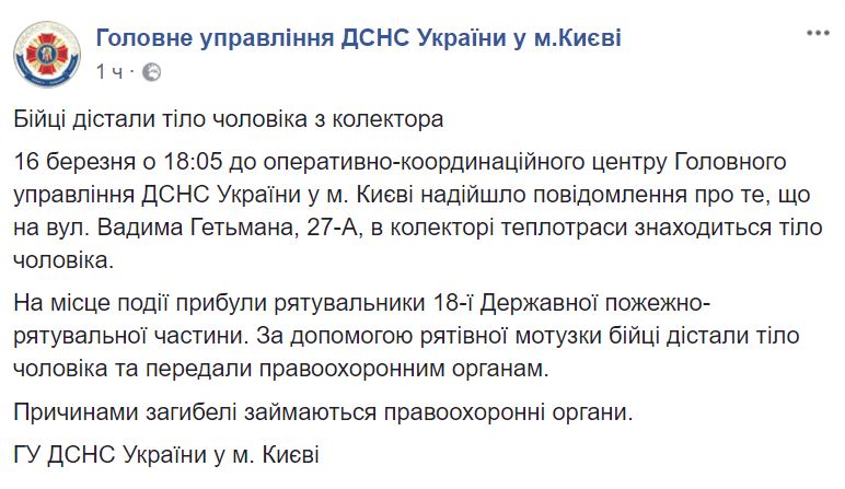16 марта в 18:05 в оперативно-координационный центр Главного управления ГСЧС в Киеве поступила информация о том, что на ул. Вадима Гетьмана, 27-а, в коллекторе теплотрассы находится тело мужчины.