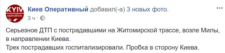 "Трех пострадавших госпитализировали. Пробка в сторону Киева", - говорится в сообщении.