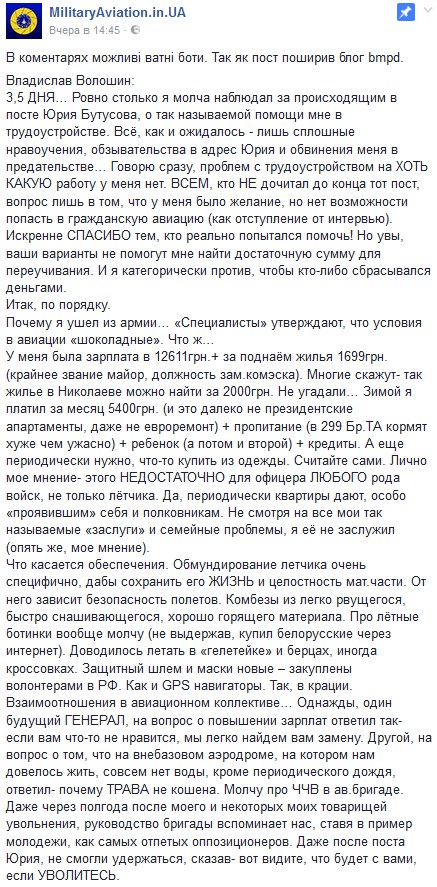 "Во-первых, пилоты боевой авиации имеют очень низкий оклад, который не позволяет нормально обеспечивать собственную семью всем необходимым", - написал он. Сам, Волошин, находясь в звании майора, получал оклад в 12611 гривен и денежную сумму на наем жилья в размере 1699 гривен.