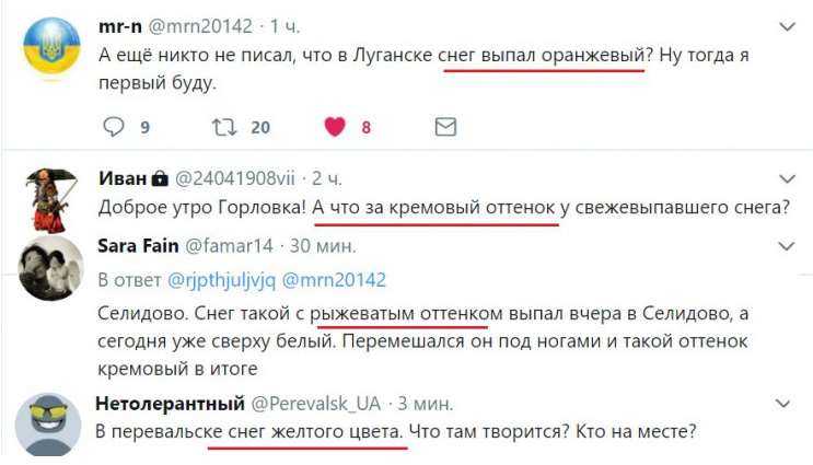 В разных населенных пунктах Луганской и Донецкой области выпал цветной снег – от оранжевого до кремового оттенка. О таком снеге сообщают пользователи соцсетей в Луганске, Перевальске, Новолуганске, Светлодарске и т. д.