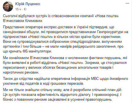 Генпрокурор Юрий Луценко провел встречу с соучредителем "Новой почты" Вячеславом Климовым после недавних обысков и пояснил их причину.