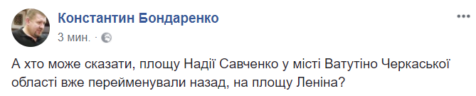 11:01  "А кто может сказать, площадь Надежды Савченко в городе Ватутино Черкасской области уже переименовали обратно на площадь Ленина?", - интересуется политолог Константин Бондаренко.