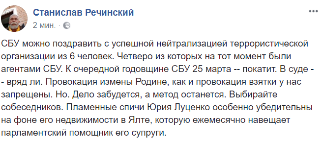 10:52  "СБУ можно поздравить с успешной нейтрализацией террористической организации из 6 человек. Четверо из которых на тот момент были агентами СБУ. К очередной годовщине СБУ 25 марта - покатит. В суде - вряд ли.