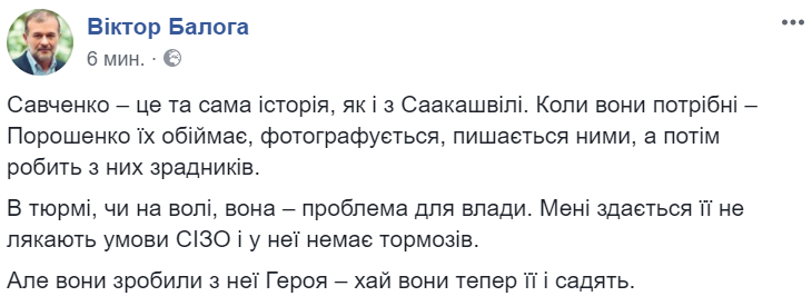 Но они сделали из нее Героя - пусть они теперь ее и сажают", - пишет в Facebook нардеп Виктор Балога.