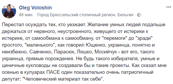 "Желание умных людей подальше держаться от нервного, неустроенного, живущего от истерики к истерике, от самообмана к самообману, от "перемоги" до "зради" простого, "маленького", как говорил Ющенко, украинца, понятно и неизбежно. Савченко, Парасюк, Ляшко, Мосийчук - вот его, такого украинца, прямые порождения. Не будь такого избирателя, умные и циничные кукловоды не создавали бы и такие проекты. Как сказал мне осенью в кулуарах ПАСЕ один показательно очень патриотичный депутат: "Человеческий материал так себе"".