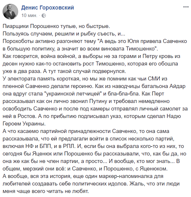 16:10  "Порохоботы активно разгоняют тему "А ведь это Юля привела Савченко в большую политику, а значит во всем виновата Тимошенко"", - отмечает журналист Денис Гороховский.