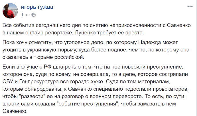 13:12  "Смотрю прямую трансляцию из Рады, где должны показать видео-доказательства подготовки Савченко теракта.
