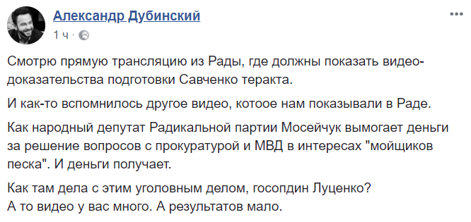 И как-то вспомнилось другое видео, котоое нам показывали в Раде. Как народный депутат Радикальной партии Мосейчук вымогает деньги за решение вопросов с прокуратурой и МВД в интересах "мойщиков песка". И деньги получает.