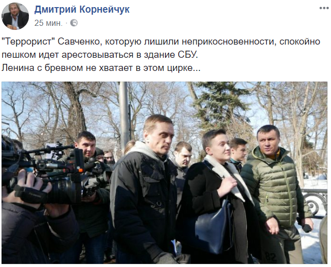 16:14  ""Террорист" Савченко, которую лишили неприкосновенности, спокойно пешком идет арестовываться в здание СБУ. Ленина с бревном не хватает в этом цирке", - пишет политолог Дмитрий Корнейчук.