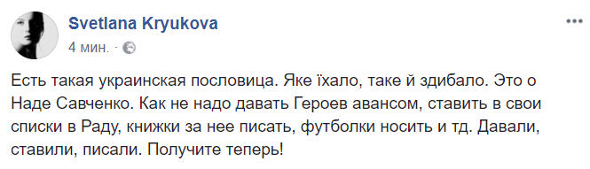 11:03  "Есть такая украинская пословица. Яке їхало, таке й здибало. Это о Наде Савченко. Как не надо давать Героев авансом, ставить в свои списки в Раду, книжки за нее писать, футболки носить и тд. Давали, ставили, писали. Получите теперь!", - пишет в Facebook журналист Светлана Крюкова.