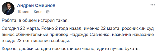 15:22  Юрист Андрей Смирнов вспомнил, что российский суд осудил Савченко ровно 2 года назад - 22 марта 2016 года. Интересное совпадение дат. А заодно и двоек - в РФ Савченко дали 22 года.