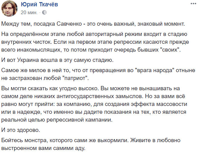 Бойтесь монстра, которого сами же выкормили. Живите в любовно выстроенном вами самими аду", - пишет журналист Юрий Ткачев.