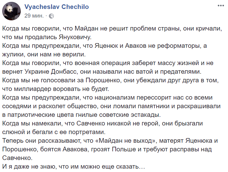 16:07  Журналист Вячеслав Чечило пишет о тех, кто называл Савченко героем, а теперь отвернулся от нее.