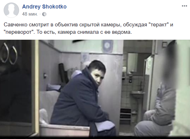 14:34  "Савченко смотрит в объектив скрытой камеры, обсуждая "теракт" и "переворот". То есть, камера снимала с ее ведома", - пишет журналист Андрей Шокотко.