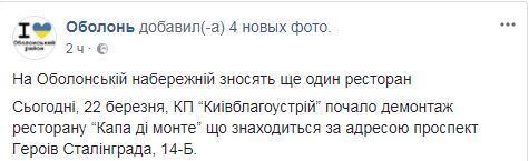 "На Оболонской набережной сносят еще один ресторан", - говорится в сообщении.