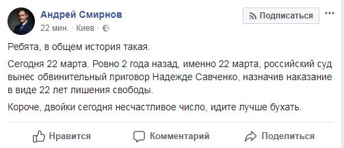"Сегодня 22 марта. Ровно 2 года назад, именно 22 марта, российский суд вынес обвинительный приговор Надежде Савченко, назначив наказание в виде 22 лет лишения свободы. Короче, двойки сегодня несчастливое число, идите лучше бухать", - написал он.
