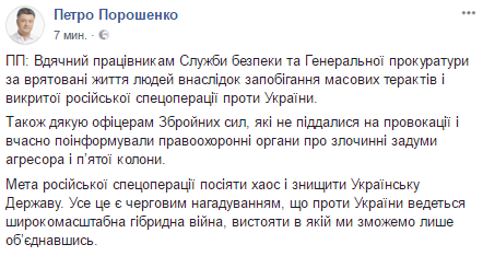Президент Петр Порошенко поблагодарил сотрудников СБУ и ГПУ "за спасенные жизни людей в результате предотвращения массовых терактов и разоблаченной российской спецоперации против Украины".