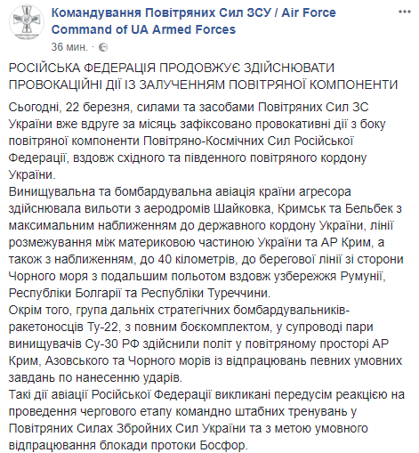 "Истребительная и бомбардировочная авиация страны агрессора осуществляла вылеты с аэродромов Шайковка, Крымск и Бельбек с максимальным приближением к государственной границе Украины, линии разграничения между материковой частью Украины и АР Крым, а также с приближением до 40 км к береговой линии со стороны Черного моря с дальнейшим полетом вдоль побережья Румынии, Болгарии и Турции. Кроме того, группа дальних стратегических бомбардировщиков-ракетоносцев Ту-22 с полным боекомплектом в сопровождении пары истребителей Су-30 РФ осуществила полет в воздушном пространстве АР Крым, Азовского и Черного морей по отработке определенных условных заданий по нанесению ударов", - говорится в сообщении.
