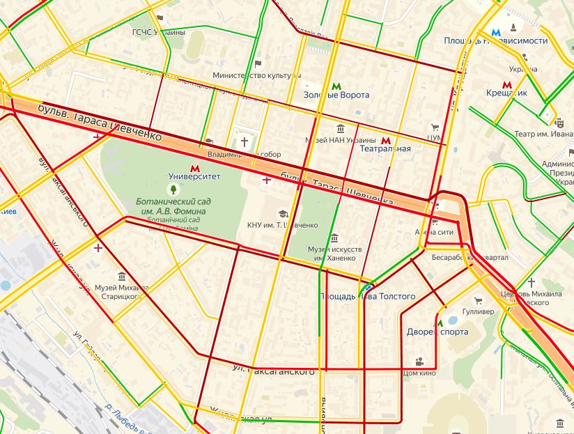 Как можно увидеть по карте "Яндекс", в обе стороны стоит бульвар Тараса Шевченко от Бессарабской площади до Цирка (транспорт движется со скоростью 5 км/ч), улица Бассейная и бульвар Леси Украинки в сторону Печерска.