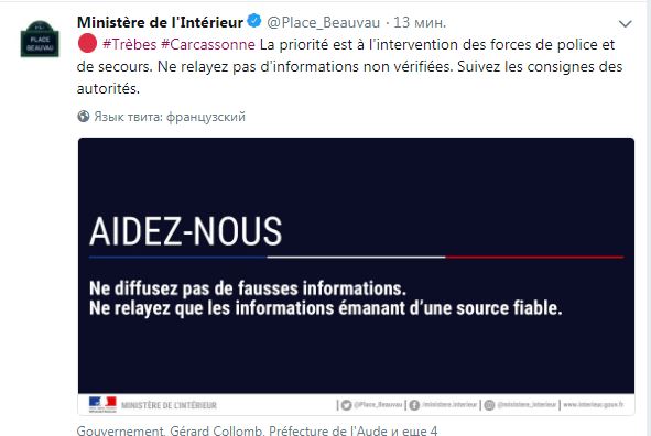 Инцидент уже прокомментировало МВД Франции. В официальном Twitter ведомства появилось сообщение, согласно которому полиция продолжает работать на месте происшествия. Приоритетом операции является спасение заложников.