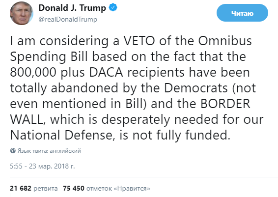 "Я рассматриваю наложение вето на законопроект о расходах на основании того, что более 800 тыс. участников программы DACA (защищающей мигрантов, ввезенных родителями - нелегалами в страну были полностью брошены демократами [и даже не упомянуты в законопроекте], а также из-за стены на границе, которая крайне необходима для защиты страны, но не была профинансирована", - написал президен США.