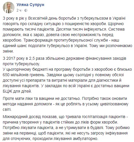 Исполняющая обязанности министра здравоохранения Украины Ульяна Супрун предлагает лечить больных туберкулезом амбулаторно. Об этом она написала на своей странице в Facebook.