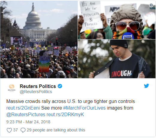 Десятитысячные митинги прошли в таких городах как Бостон, Нью-Йорк, Лос-Анджелес, Чикаго, Хьюстон, Феникс, Форт-Уорт, штат Техас, Миннеаполис и Паркленд. Протесты были и в штате Флорида, где в результате нападения в средней школе 14 февраля погибло 17 человек.