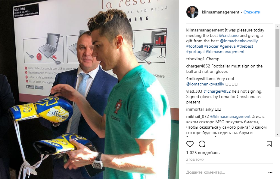 "Было приятно встретиться с лучшим [футболистом] Криштиану Роналду и передать ему подарок от лучшего [боксера] Василия Ломаченко", написал Климас.