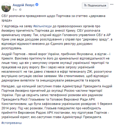 "В ответ на заявление ГО "Вільні люди" в правоохранительные органы о возможной причастности Портнова к аннексии Крыма, СБУ начала уголовное дело. Так, следственный отдел Главного управления СБУ в АР Крым уже ведет досудебное расследование по делу о "государственной измене", а соответствующие сведения внесены в Единый реестр досудебных расследований", - написал он.
