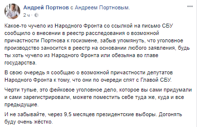 "Какое-то чучело из Народного Фронта со ссылкой на письмо СБУ сообщило о внесении в реестр расследования о возможной причастности Портнова к госизмене, забыв упомянуть, что уголовное производство заносится в реестр на основании любого заявления, будь ты хоть чучело из Народного Фронта или обезьяна во главе государства. В свою очередь я сообщаю о возможной причастности депутатов Народного Фронта к тому, что они по очереди спят с главой СБУ. Черти тупые, это фейковое уголовное дело, которое вы сами придумали и сами зарегистрировали, можете поместить себе туда же, куда и все предыдущие. И не забывайте, через 9,5 месяцев президентские выборы. Догонять буду очень жёстко", - прокомментировал Андрей Портнов на своей странице в Facebook.