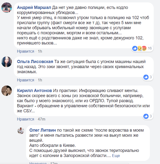 Андрей Маршал: "У меня умер отец, я позвонил утром только в полицию на 102 чтоб прислали группу (факт смерти все же т д), так через 5 мин мне начали обрывать мобильный номер звонящие с услугами порешать с похоронами, моргом и всем остальным... никто еще из родственников даже не знал, кроме дежурного 102, принявшего вызов".