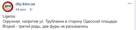 По данным ресурса dtp.kiev.ua из-за того, что столкнулись две фуры масштабная пробка возникла напротив ул. Трублаини в сторону Одесской площади.
