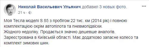 "Моя Тесла модели S 85 с пробегом 22 тыс. км (2014 год) и полной комплектацией кроме автопилота и пневмоподвески. Ни одного недостатка. Продается значительно дешевле аналогов. Зарегистрирована в Киевской области. Имеет дополнительно запасное колесо и комплект зимних шин", - пишет Ульянич.