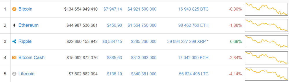 За сутки Bitcoin подешевел на 0,12 % до $7 947, Ethereum - на 2,02% до $456, Bitcoin Саsh - на 1,83% до $885, Litecoin - на 4,34 % до $136.