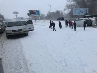 Снег и скользкая дорога. На Бориспольской трассе перевернулся микроавтобус