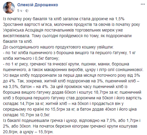 Об этом говорится на странице главы Ассоциации поставщиков торговых сетей и депутата Киеврады Алексея Дорошенко.