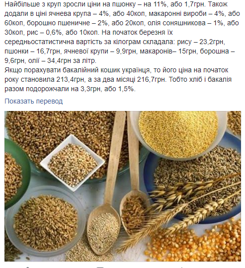 "В начале марта среднестатистическая стоимость за килограмм составляла для риса 23,2 грн, для пшонки – 16,7 грн, для ячневой крупы – 9,9 грн, для макарон – 15 грн, для муки – 9,6 грн, для масла – 34,4 грн за литр.