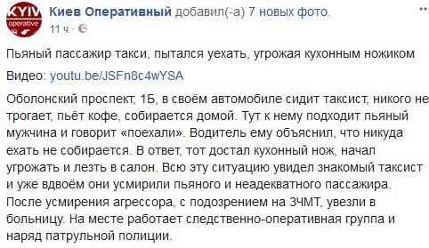 "Оболонский проспект, 1Б, в своём автомобиле сидит таксист, никого не трогает, пьёт кофе, собирается домой. Тут к нему подходит пьяный мужчина и говорит "поехали". Водитель ему объяснил, что никуда ехать не собирается. В ответ, тот достал кухонный нож, начал угрожать и лезть в салон", - сказано в сообщении.