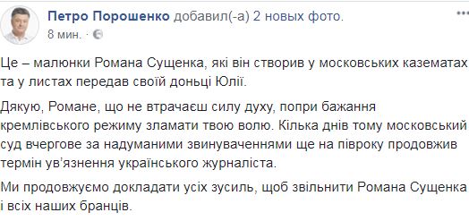 Президент Украины Петр Порошенко поделился двумя рисунками украинского журналиста Романа Сущенко, которые тот нарисовал в Лефортовском СИЗО России.