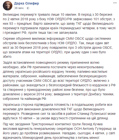 "Украинская сторона подтвердила готовность и в дальнейшем делать все возможное для выполнения договоренностей ТКГ по пасхальному перемирию. Разведение сил и средств в районе Станицы Луганской может состояться 10 апреля - при отсутствии стрельбы на этом участке", - написала Олифер.
