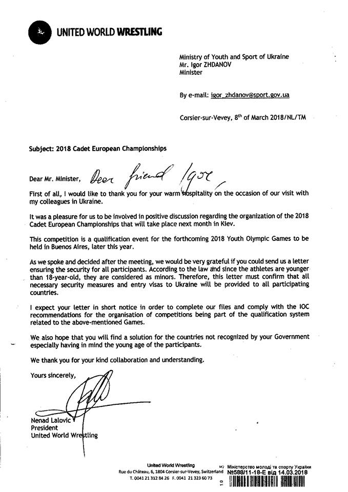 “На всех встречах высокого уровня руководству UWW отмечалось, что во время подготовки к соревнованиям правительством будут созданы условия, гарантирующие безопасность и уважение к каждому спортсмену в полном соответствии с международными правилами и действующим законодательством Украины. Однако отдельно было отмечено, что спортсмены, которые незаконно находились на оккупированных территориях Украины — в Крыму, отдельных районах Донецкой и Луганской областей, к соревнованиям допущены не будут”, - отметил Жданов.