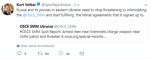 "Россия и поддерживаемые ею боевики на востоке Украины должны прекратить угрожать или запугивать СММ ОБСЕ и начать выполнять Минские договоренности", - написал Волкер.