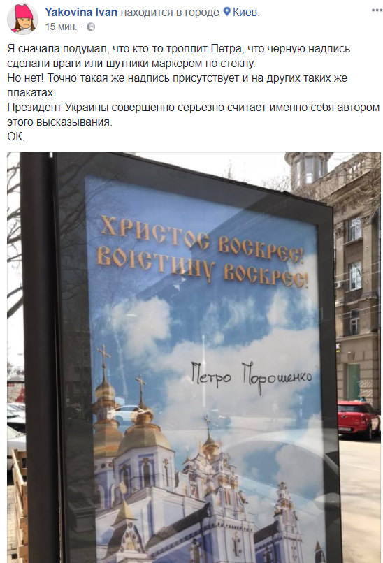 "Я сначала подумал, что кто-то троллит Петра, что черную надпись сделали враги или шутники маркером по стеклу. Но нет! Точно такая же надпись присутствует и на других таких же плакатах. Президент Украины совершенно серьезно считает именно себя автором этого высказывания", – пишет журналист Иван Яковина.