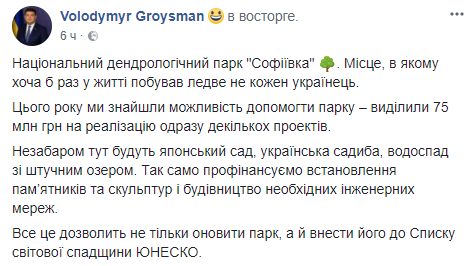"В этом году мы нашли возможность помочь парка - выделили 75 млн грн на реализацию сразу нескольких проектов.