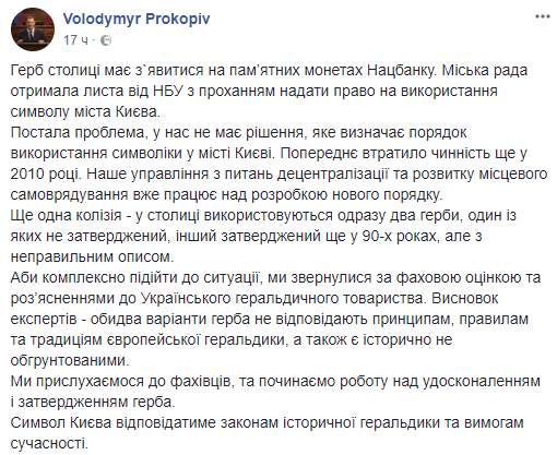 "Герб столицы должен появиться на памятных монетах Нацбанка. Городской совет получил письмо от НБУ с просьбой предоставить право на использование символа города Киева. Возникла проблема, у нас нет решения, которое определяет порядок использования символики в городе Киеве. Предварительное утратило силу еще в 2010 году. Наше управление по вопросам децентрализации и развития местного самоуправления уже работает над разработкой нового порядка", - написал он.