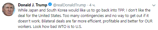 "Хотя Япония и Южная Корея хотели бы, чтобы мы вернулись в ТТП, мне не нравится эта сделка для США. Слишком много обязательств и никакой возможности выйти из него, если оно не работает", - написал Трамп .