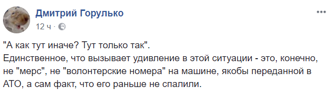 "Единственное, что вызывает удивление в этой ситуации - это, конечно, не "мерс", не "волонтерские номера" на машине, якобы переданной в АТО, а сам факт, что его раньше не спалили", - пишет журналист Дмитрий Горулько.