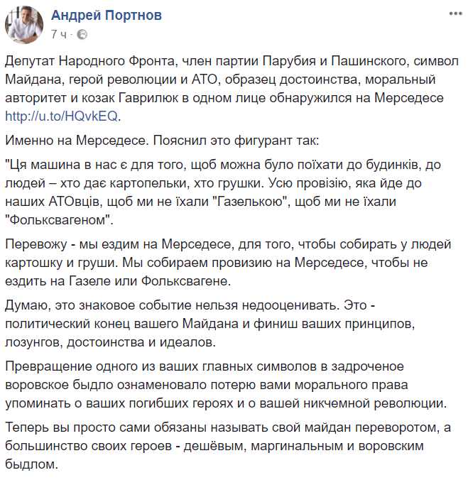 Юрист Андрей Портнов назвал историю с "Мерседесом" Гаврилюка "политическим концом Майдана":