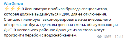 Также сообщается, что в Ясиноватую прибыла бригада специалистов, которая должна выдвинуться к ДФС для ее отключения.